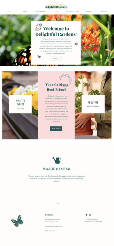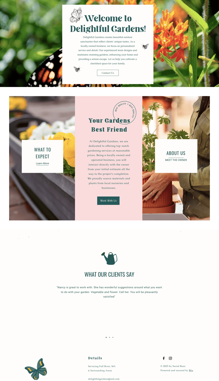 For Delightful Gardens, the existing website lacked clear navigation, useful information, and an intuitive flow — making it difficult for visitors to understand services or take action. I redesigned the site from the ground up to create a more user-friendly experience that showcases their offerings clearly and beautifully. With improved structure, simplified navigation, and strategic content placement, the new design makes it easy for potential customers to explore services, view galleries, and connect with the business. The result is a much more informative, accessible, and visually engaging website that better represents the quality and care Delightful Gardens brings to every project.